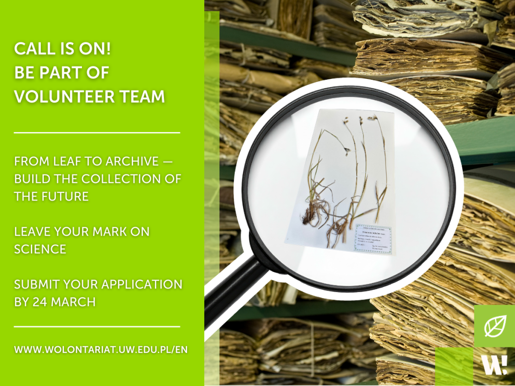 Send an email with the subject line “Herbarium UW”, including your name and surname and confirmation that you will attend the organizational meeting on 26 March, to: wolontariat[at]uw.edu.pl